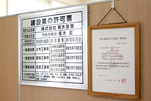 | 許可業種 | 土木、とび・土工、建築、大工、石、屋根、タイル、れんが、ブロック、鋼構造物、舗装、 しゅんせつ、塗装、内装仕上、水道施設、解体石工事業、鋼構造物工事業、舗装工事業、 水道工事業、解体工事業 |